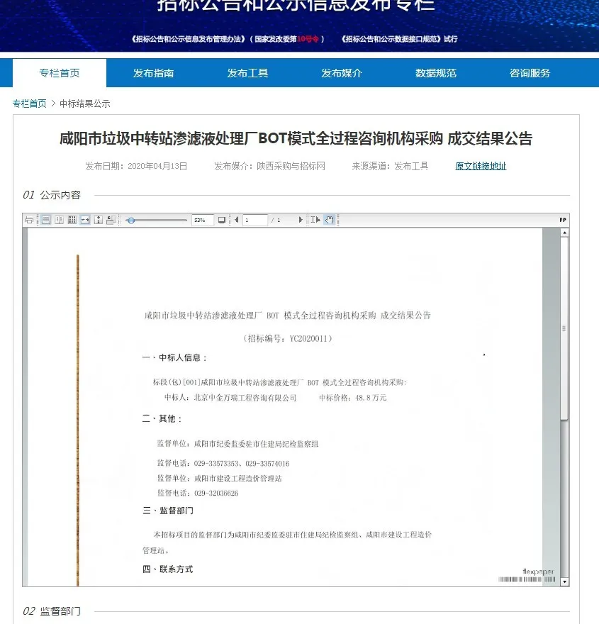 2020年4月13日陕西采购与招标网发布咸阳市垃圾中转站渗滤液处理厂BOT模式全过程咨询机构采购成交结果公告,安博电子官方网站成功中标。