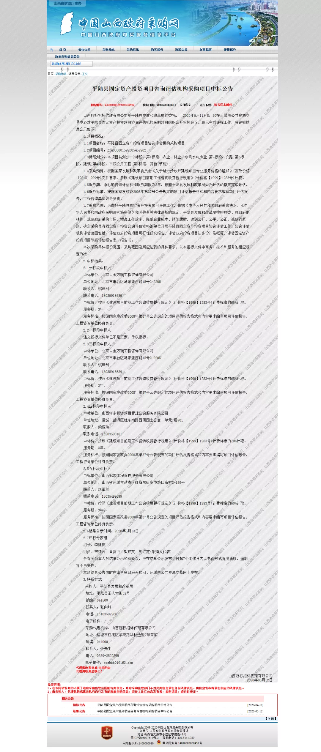 2020年5月12日,中国山西政府采购网发布《平陆县固定资产投资项目咨询评估机机构采购项目中标公告》,我公司成功入围。