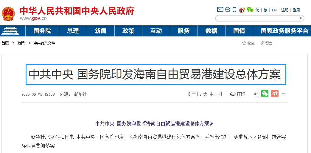 2020年6月1日,中共中央、国务院印发《海南自由贸易港建设总体方案》。总体方案包括总体要求、制度设计、分步骤分阶段安排和组织实施四大部分。《方案》提出,海南自由贸易港的实施范围为海南岛全岛,海南自由贸易港建设将以贸易投资自由化便利化为重点。“一线”放开,“二线”管住,岛内自由,推进服务贸易自由便利。