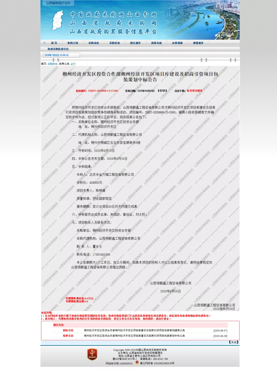 2020年6月29日,山西省政府采购网发布《朔州经济开发区项目库建设及招商引资项目包装策划中标公告》,我公司成功中标。