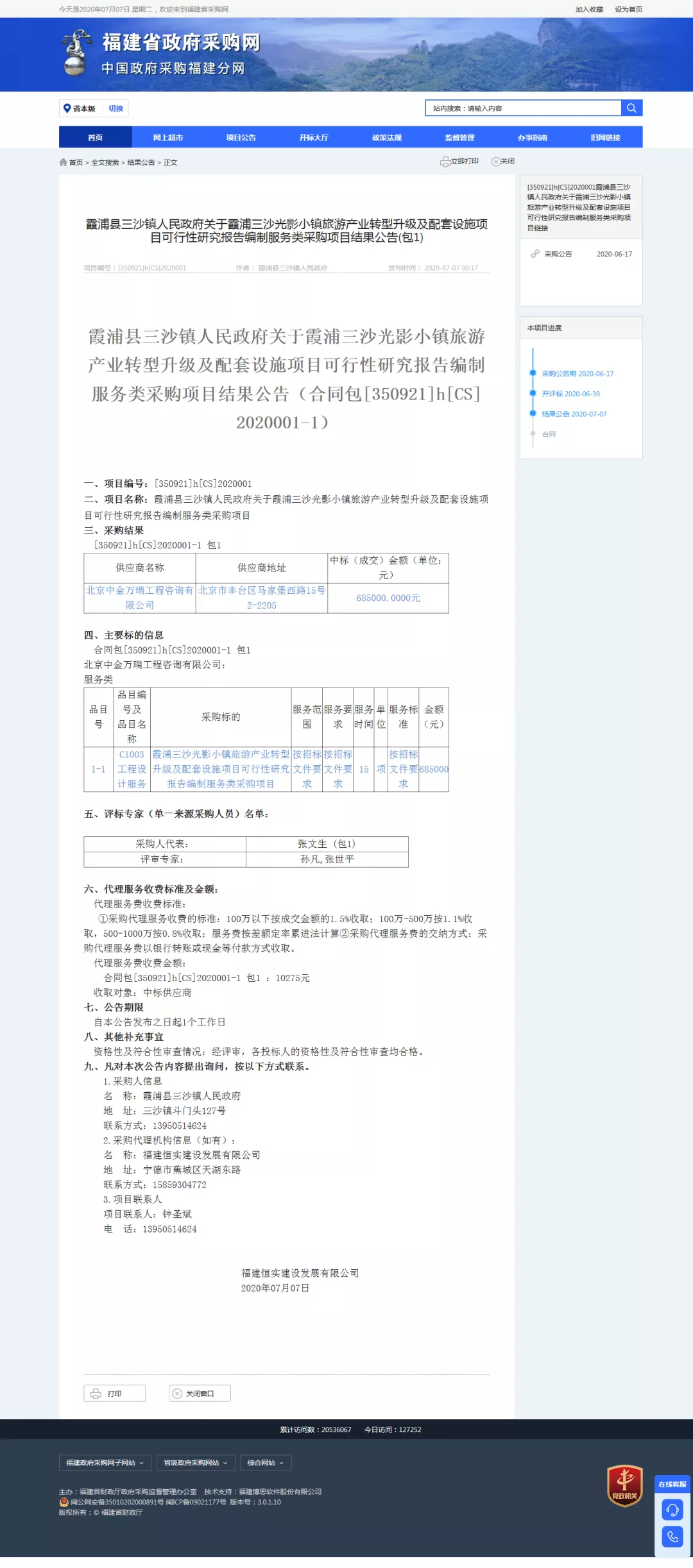 2020年7月7日,福建省政府采购网发布《霞浦县三沙镇人民政府关于霞浦三沙光影小镇旅游产业转型升级及配套设施项目可行性研究报告编制服务类采购项目结果公告(包1)》,我公司成功中标,中标金额685000元。