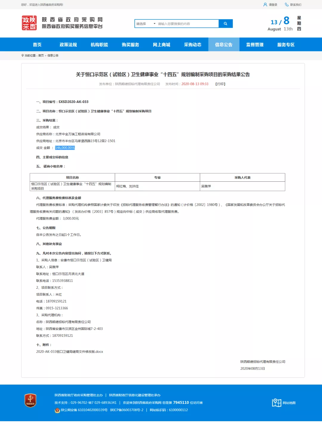 2020年8月13日,陕西省政府采购网发布《关于恒口示范区(试验区)卫生健康事业“十四五”规划编制采购项目的采购结果公告》,我公司成功中标。