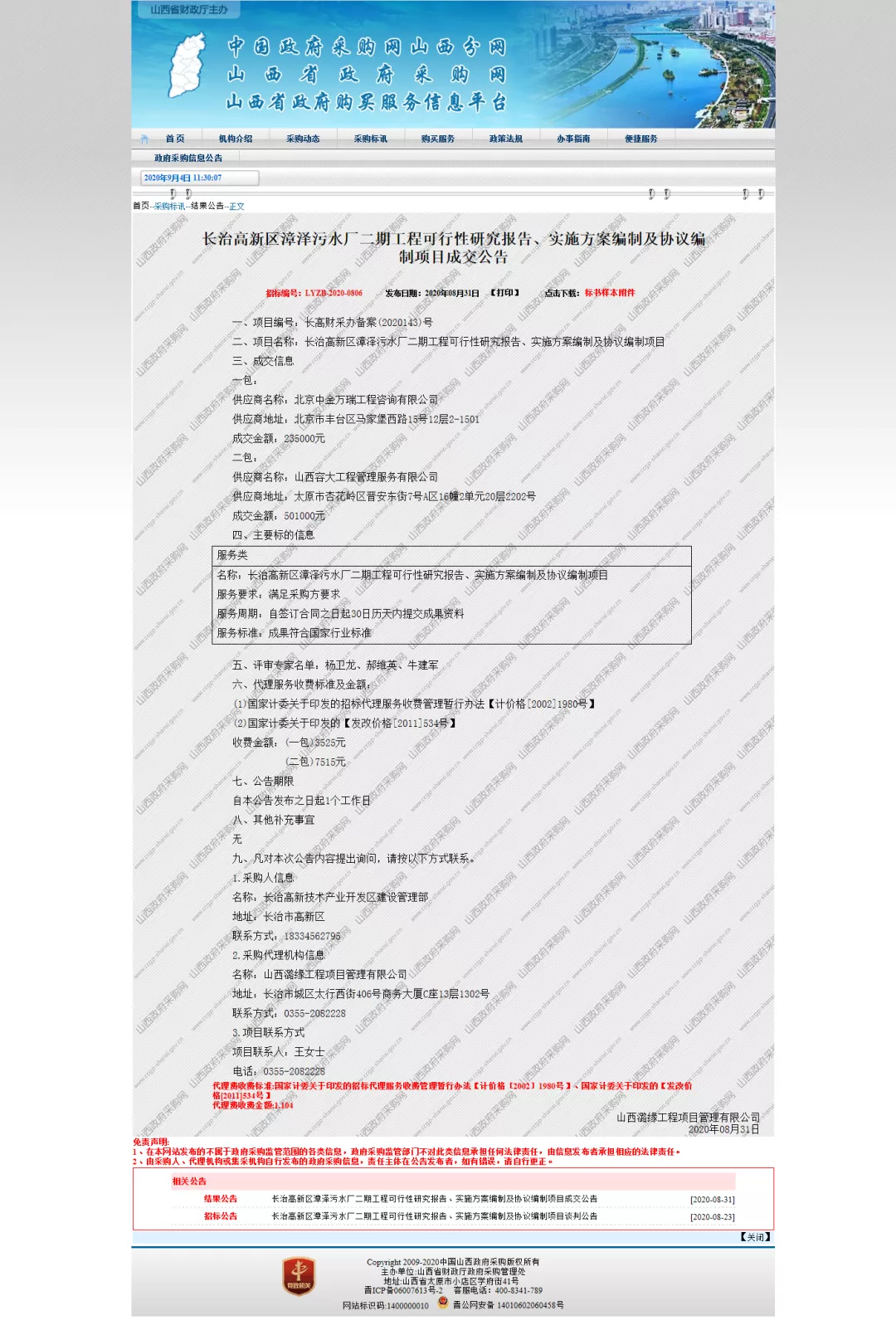 2020年8月31日,山西省政府采购网发布《长治高新区漳泽污水厂二期工程可行性研究报告、实施方案编制及协议编制项目成交公告》,我公司成功中标,中标金额235,000.00元。