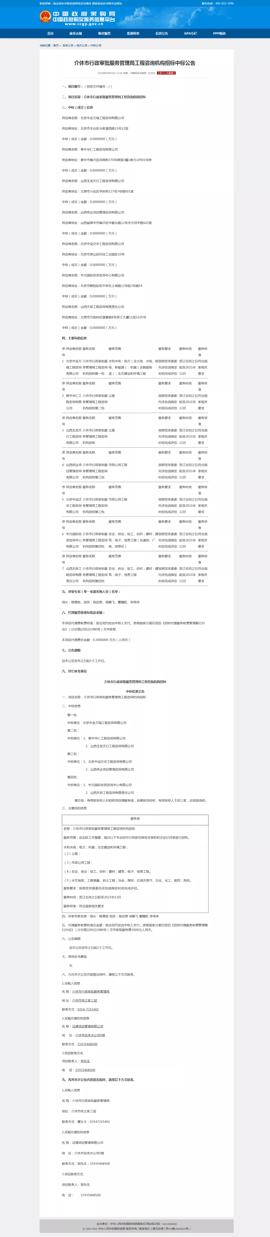 2020年9月2日,中国政府采购网发布《介休市行政审批服务管理局工程咨询机构招标中标公告》,我公司成功中标。