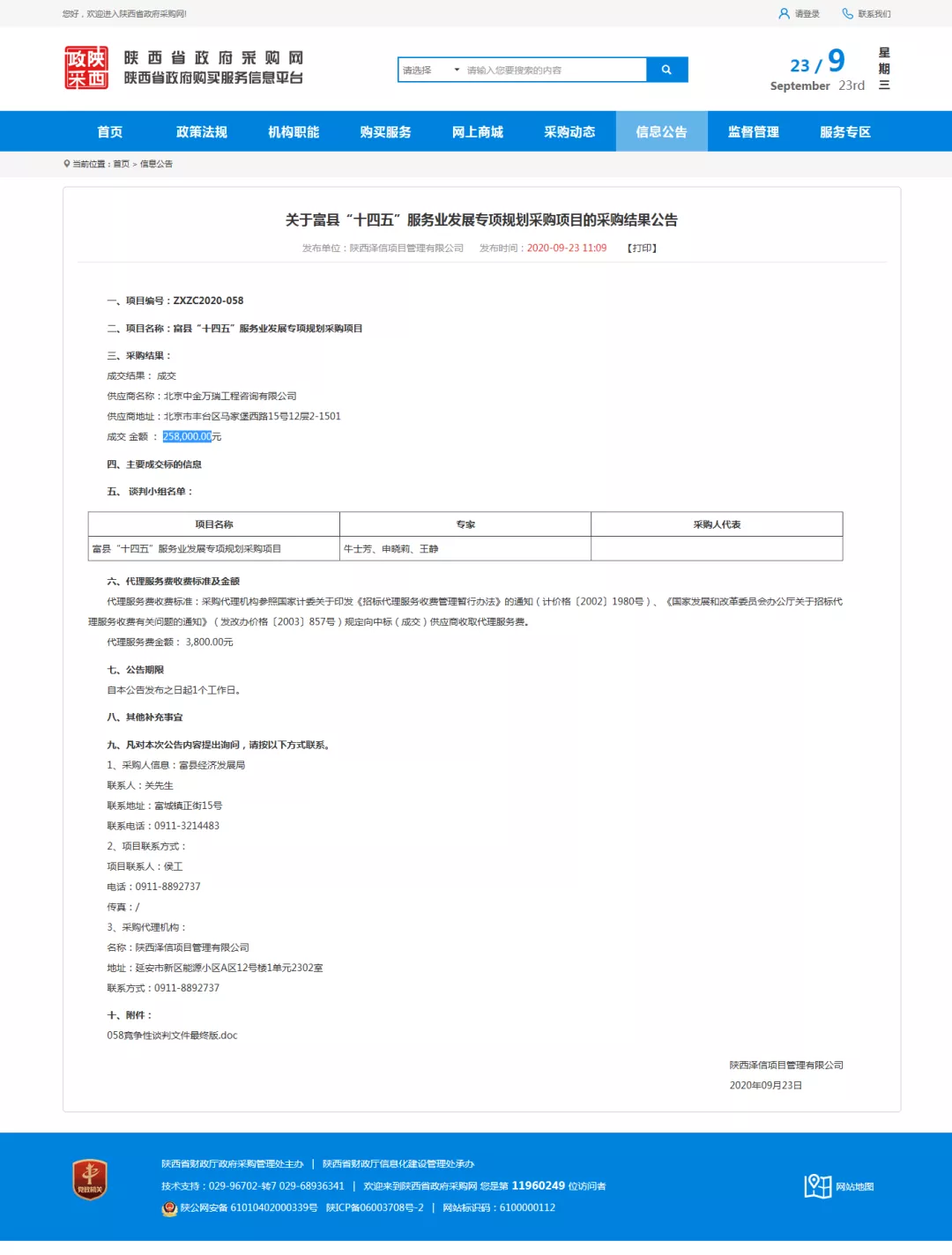 2020年9月23日,陕西省政府采购网发布《关于富县“十四五”服务业发展专项规划采购项目的采购结果公告》,我公司成功中标,中标金额258,000.00元。