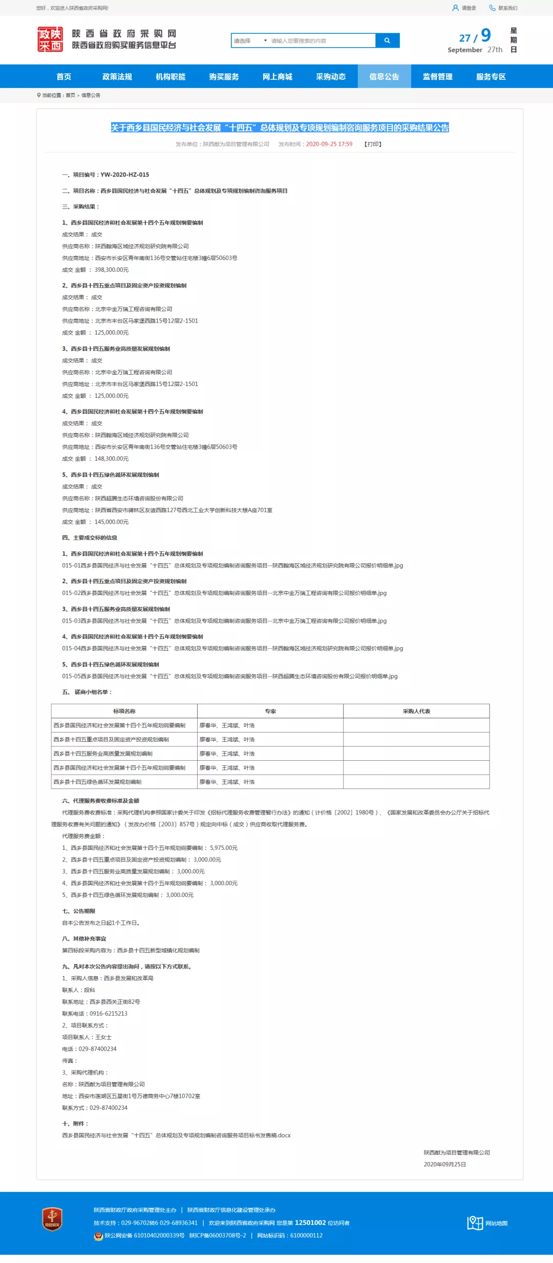 2020年9月25日,陕西省政府采购网发布《关于西乡县国民经济与社会发展“十四五”总体规划及专项规划编制咨询服务项目的采购结果公告》,我公司成功中标,中标金额250,000.00元。