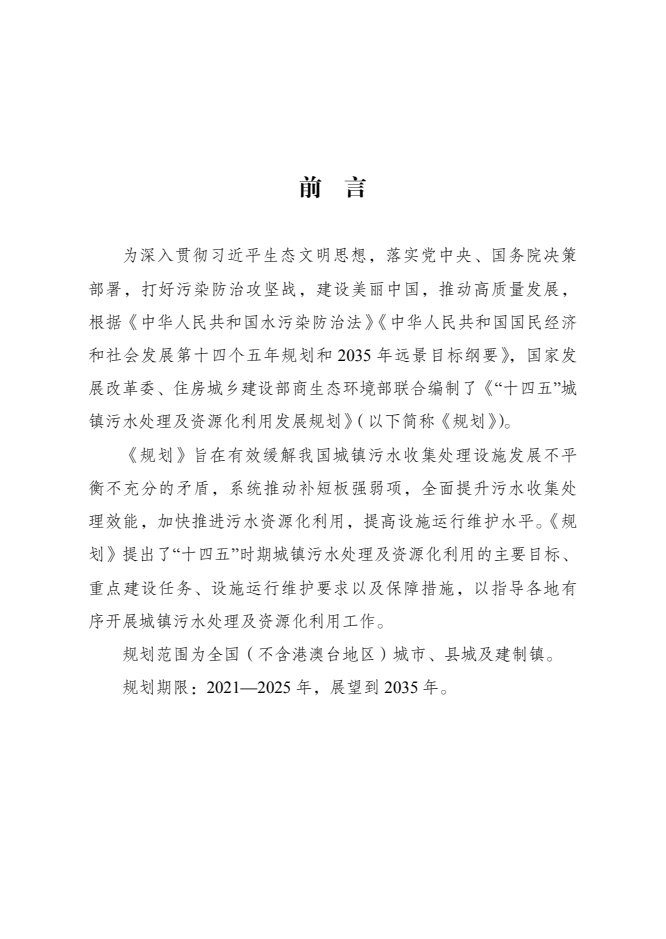 为深入贯彻习近平生态文明思想,加强生态环境保护,积极推进城镇污水处理领域补短板、强弱项工作,全面提升污水收集处理及资源化利用能力水平,国家发展改革委、住房城乡建设部商生态环境部研究编制了《“十四五”城镇污水处理及资源化利用发展规划》,现印发给你们,请认真贯彻执行。
