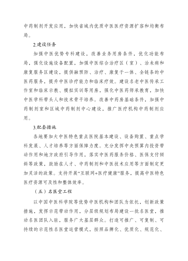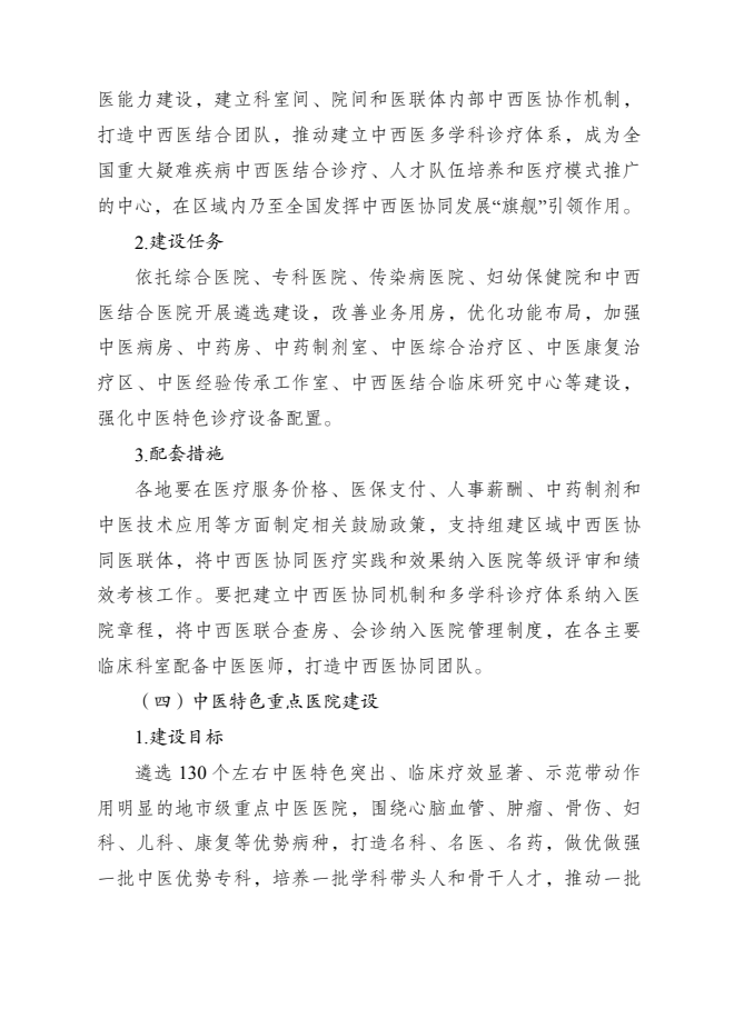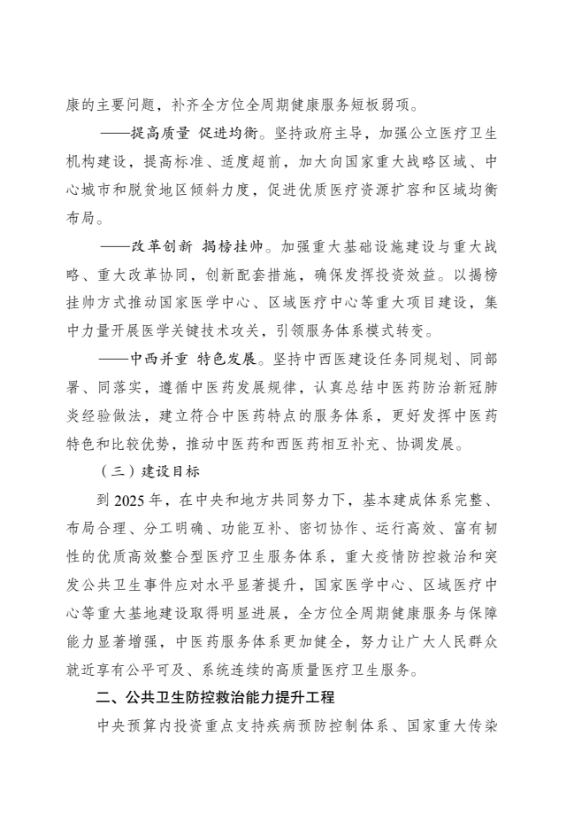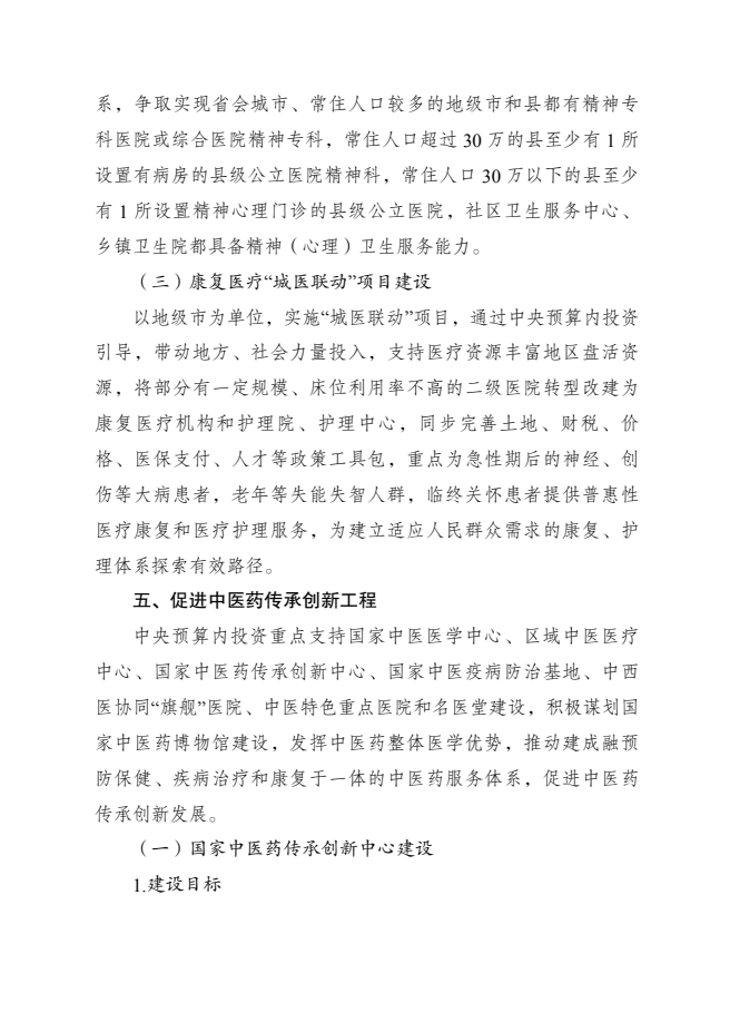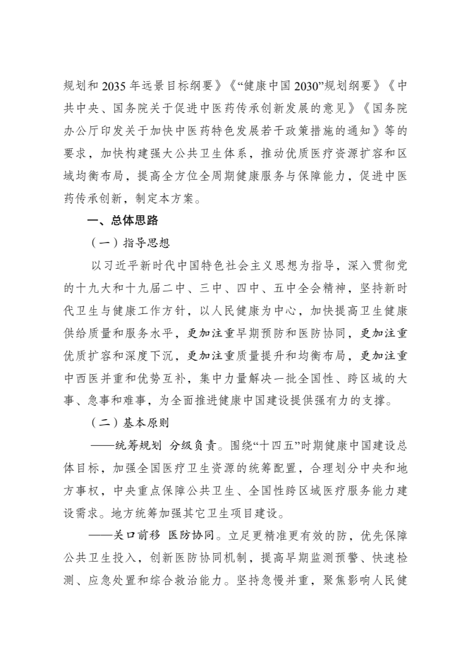 为落实《中华人民共和国国民经济和社会发展第十四个五年规划和2035年远景目标纲要》《“健康中国2030”规划纲要》《中共中央、国务院关于促进中医药传承创新发展的意见》《国务院办公厅印发关于加快中医药特色发展若干政策措施的通知》等要求,加快构建强大公共卫生体系,推动优质医疗资源扩容和区域均衡布局,提高全方位全周期健康服务与保障能力,促进中医药传承创新,国家发展改革委、国家卫生健康委、国家中医药管理局和国家疾病预防控制局共同编制了《“十四五”优质高效医疗卫生服务体系建设实施方案》。现印发给你们,请认真遵照执行。