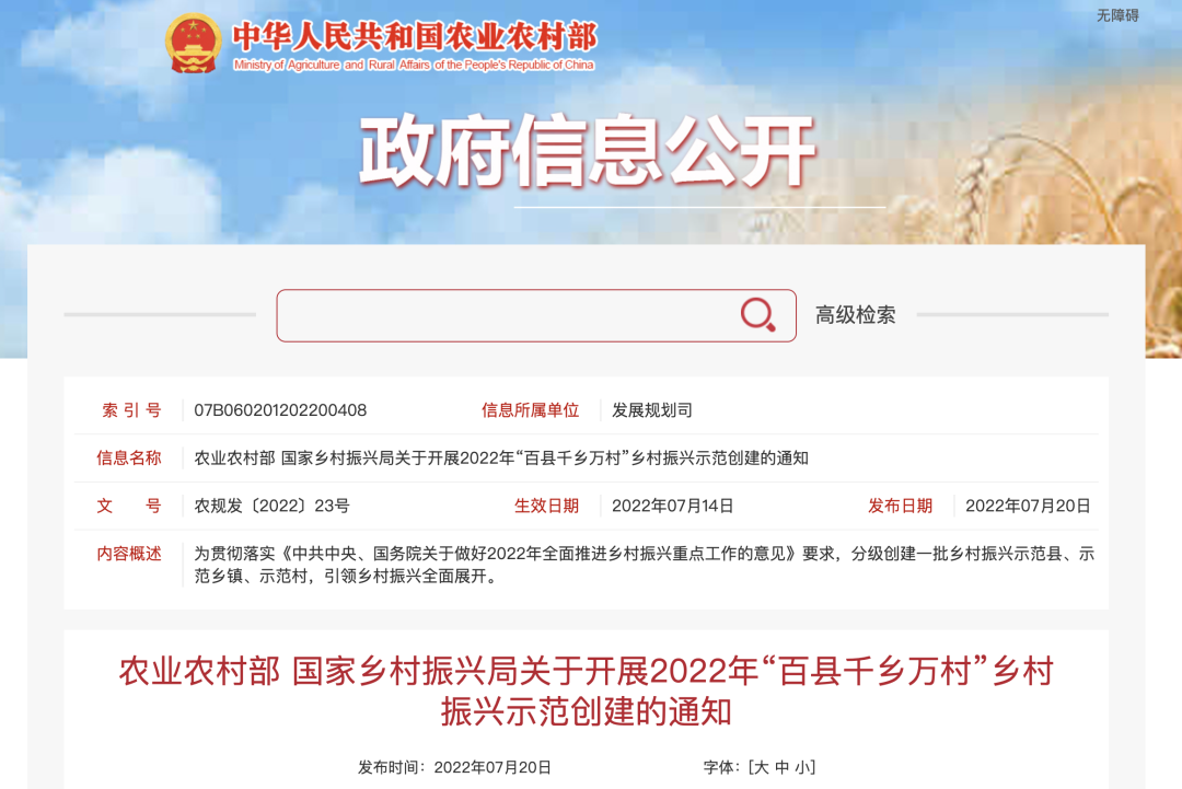 农业农村部 国家乡村振兴局关于开展2022年“百县千乡万村”乡村振兴示范创建的通知