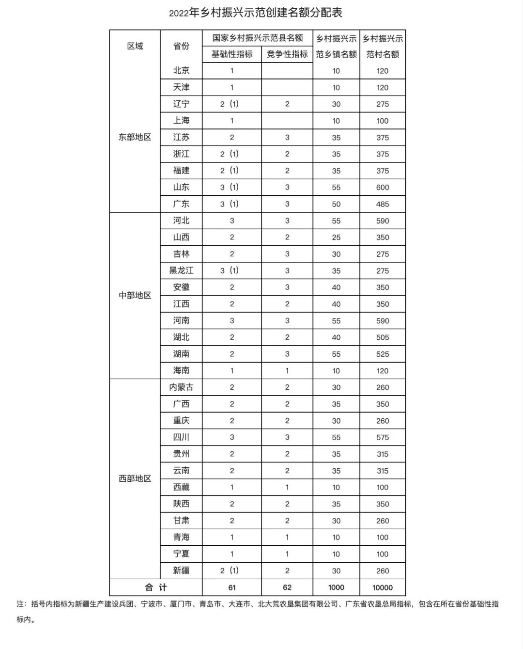 近日,农业农村部、国家乡村振兴局印发《关于开展2022年“百县千乡万村”乡村振兴示范创建的通知》。通知明确,2022年,立足县、乡、村资源禀赋和发展基础,体现东、中、西部区域特色,农业农村部、国家乡村振兴局组织创建100个左右国家乡村振兴示范县,省级农业农村部门、乡村振兴局组织创建1000个左右乡村振兴示范乡镇、10000个左右乡村振兴示范村,分层级推进示范创建。力争用5年左右时间,开展创建工作的国家乡村振兴示范县基本覆盖全国各市(地、州、盟)。