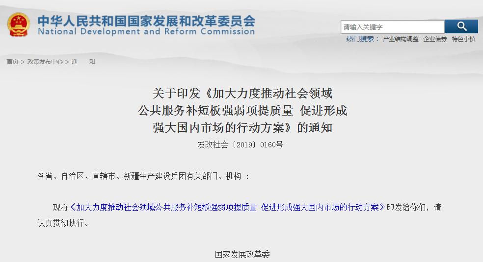关于印发《加大力度推动社会领域公共服务补短板强弱项提质量促进形成强大国内市场的行动方案》的通知发改社会〔2019〕0160号...