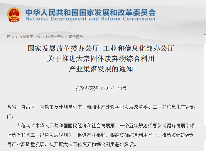 国家发展改革委办公厅工业和信息化部办公厅关于推进大宗固体废弃物综合利用产业集聚发展的通知发改办环资〔2019〕44号各省、...