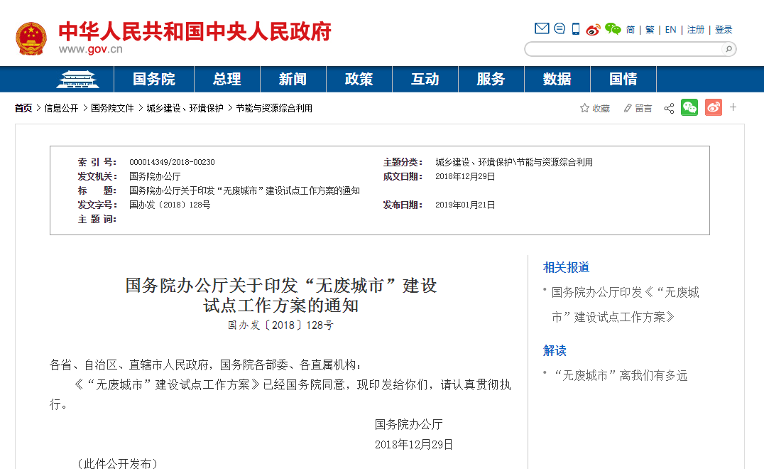 国务院办公厅关于印发“无废城市”建设试点工作方案的通知国办发〔2018〕128号各省、自治区、直辖市人民政府,国务院各部委、...
