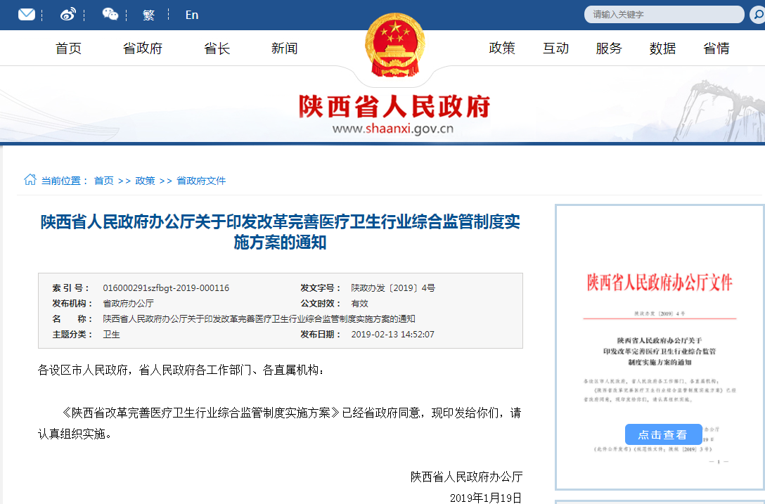 各设区市人民政府,省人民政府各工作部门、各直属机构:《陕西省改革完善医疗卫生行业综合监管制度实施方案》已经省政府同意...